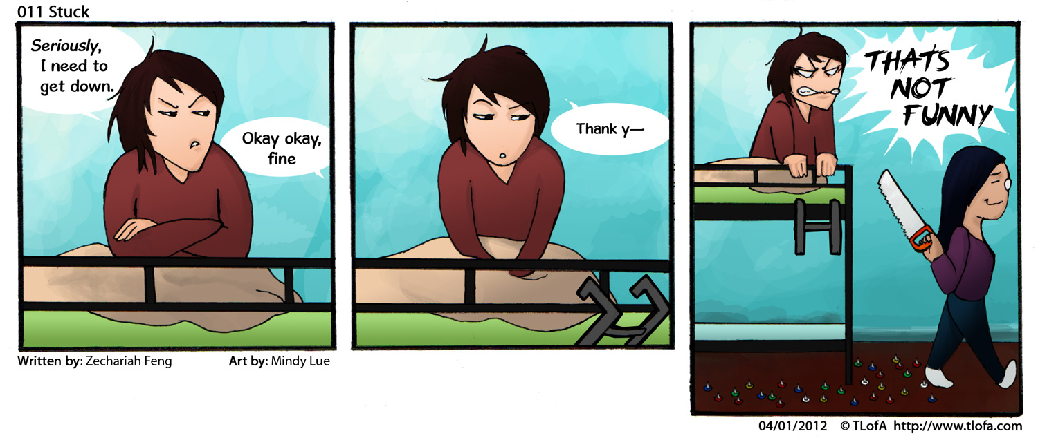 Comic 11 marks the last of the large bunch I had written up prior to our string of super-long hiatuses. You know what this means? We've burned through our written backlog. This. Is. Horrifying. Write new comics? REALLY?!